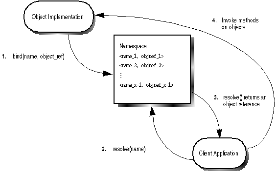 You must obtain at least one of these NamingContext objects before your object implementations can bind names to their objects and before client applications can resolve a name to an object reference.