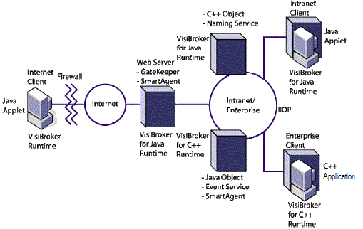 A Java run-time environment is required for any end user who wishes to execute VisiBroker services and tools. A Java runtime environment is an engine that interprets and executes a Java application. Typically, Java runtime environments are bundled with Java development environments. See “Java 2 Standard Edition” for details.Also, object implementations written with VisiBroker for Java will work with clients written in VisiBroker for C++. In fact, a server written with VisiBroker for Java will work with any CORBA-compliant client; a client written with VisiBroker for Java will work with any CORBA-compliant server. This also applies to any VisiBroker for C++ object implementations.VisiBroker conforms with the OMG IDL/Java Language Mapping Specification. See the VisiBroker Programmer's Reference for a summary of VisiBroker's current IDL to Java language mapping, as implemented by the idl2java compiler. For each IDL construct there is a section that describes the corresponding Java construct, along with code samples.For more information about the mapping specification, refer to the OMG IDL/Java Language Mapping Specification.