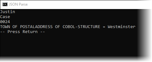 The array fields have been set to the maximum number, hence the PARSE informs us that there were less occurrences in the JSON string than the array is set to hold. There is also a list of the fields that were not parsed, as they were not present in the COBOL data structure. Lastly, the display statements confirm the contents of the fields, and the lastName field was correctly suppressed.