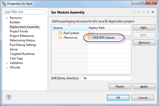 3. Double-click the Deploy Path entry for the Resources source and update it to WEB/INF/classes, then click OK.