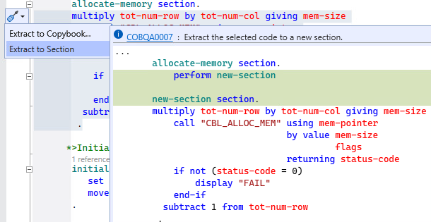 Executing this command replaces the selection a perform new-section statement. It also adds a new section called new-section.