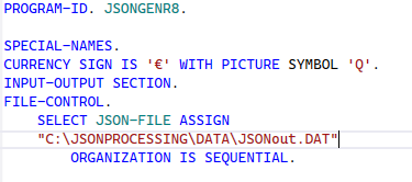 You will run the program a number of times, using different declarations of the JSON GENERATE statement - the declarations are in the J100-SIMPLE-GENERATE, J200-GENERATE-EXCEPTION, and J300-COMPLEX-GENERATE paragraphs.