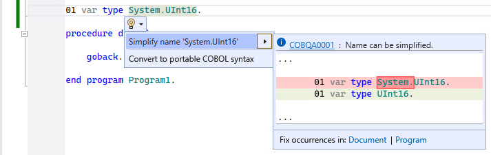 The light bulb quick action, Convert to COBOL Syntax, is available for some .NET types that have a corresponding predefined .NET COBOL type. You can convert such types to COBOL predefined types - for example, System.UInt64 converts to binary-double unsigned.