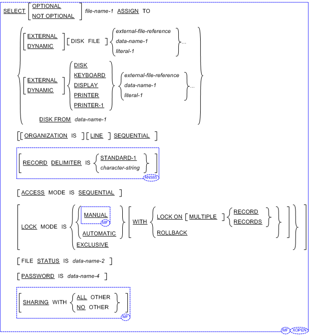 Although they are a part of the standard COBOL definition, the RECORD DELIMITER and RESERVE phrases and ellipses in the ASSIGN
