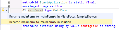 You can use the Rename quick action to rename a variable, a section or paragraph name, or an identifier in a file or in the entire solution: