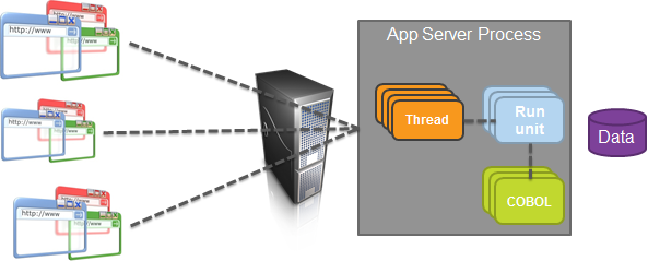 .NET server applications, such as ASP.NET and WCF Services, typically have multiple users, each user running a session simultaneously with other users, whereas COBOL applications traditionally run single sessions each independent of each other. In .NET, server applications are executed and controlled by application domains. Each application domain can execute multiple instances of an application at the same time.