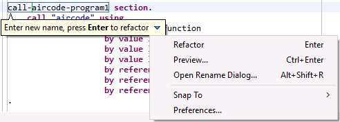 Visual COBOL enables you to rename all or selected occurrences in the workspace of variable, section and paragraph names (in native COBOL), of identifiers (in JVM COBOL), or of COBOL types that are referenced in Java code and vice versa.